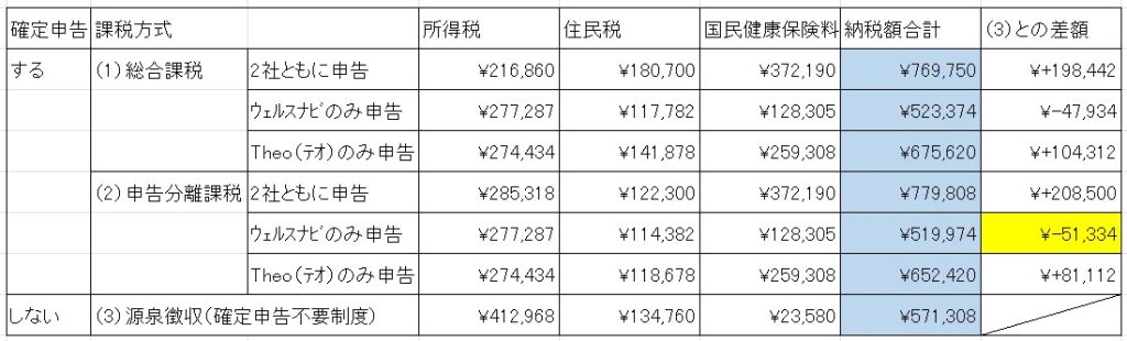 今回、場合分けは7通りで、確定申告する/しない、総合課税/申告分離課税、2社ともに申告/ウェルスナビのみ申告/Theo(テオ)のみ申告となります。